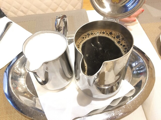 コーヒーを頼むと銀のコーヒーを入れる器とミルクを入れる器が