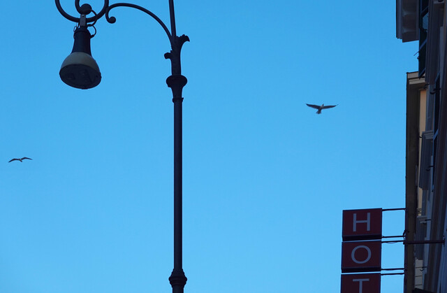 の前に鳩がいて見上げればローマの青い空にカモメが数羽、右にデポ