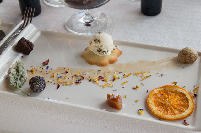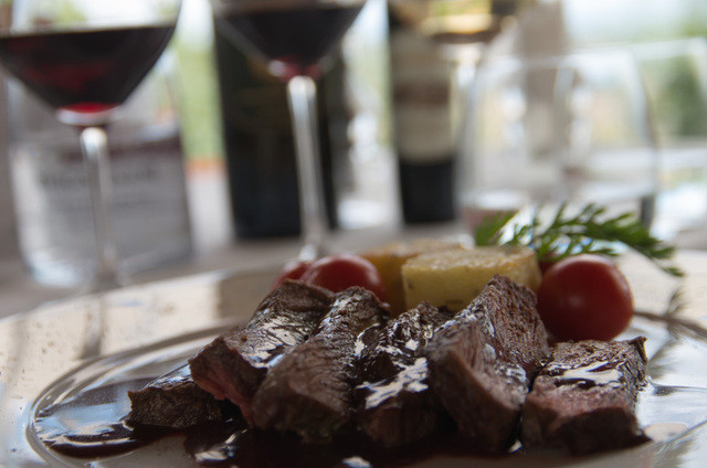 キアニーナ牛フィレ肉のタリアータ、ヴィーノ・ノービレ・ディ・モンテプルチャーノのソース、ローストポテトとトマトのコンフィ添え2