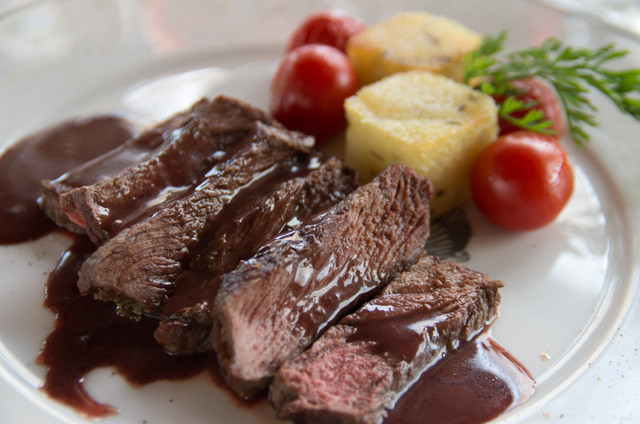 キアニーナ牛フィレ肉のタリアータ、ヴィーノ・ノービレ・ディ・モンテプルチャーノのソース、ローストポテトとトマトのコンフィ添え1