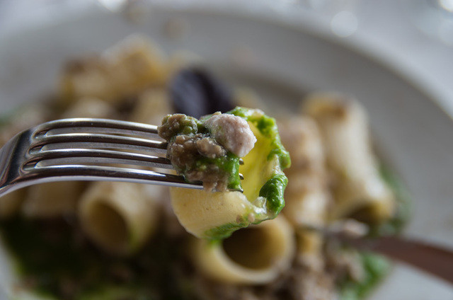 パッケリ、仔羊のラグーソース、チャードクリームとシナモンスパイスのリコッタチーズでのアップ