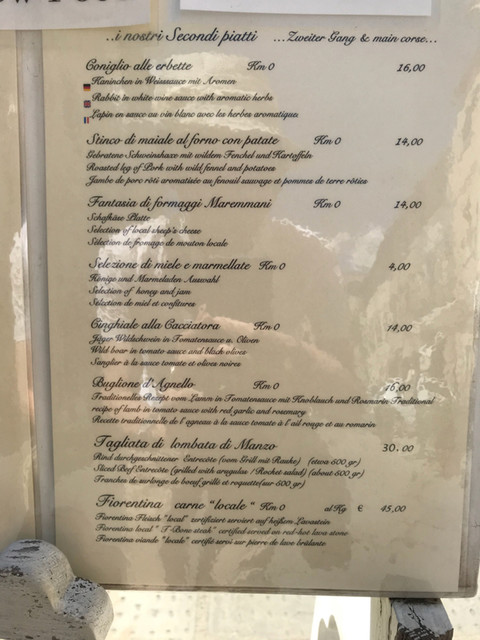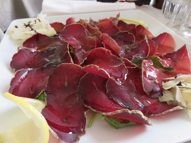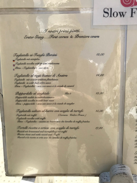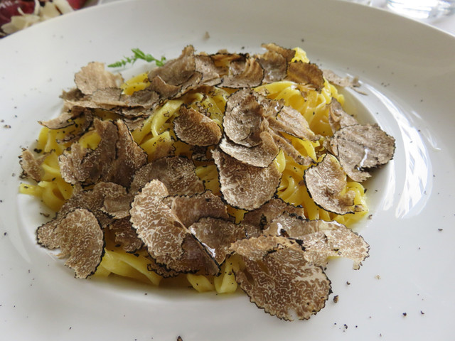 さて、頂いたのは、イタリア中、どこでもありそうな定番メニュー、トリュフ添のタリアテッレ。香りが良く、これまで食べた中でもかなり良いレベル。16ユーロです。