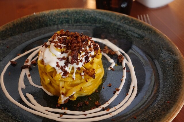 パスタは、グアンチャーレのクロッカンテとストラッチャテッラのパスタ。クロッカンテぶりがすごい。