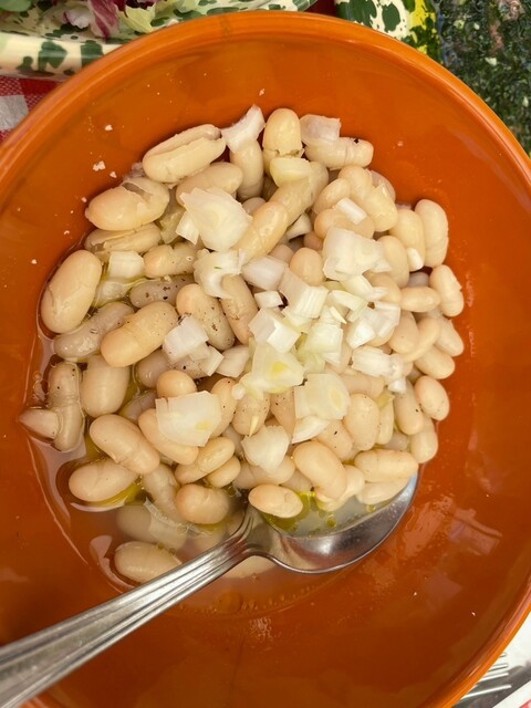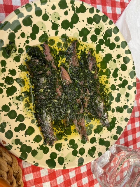 Acciughe Sotto Pesto、ペコリーノのグリル、リコッタとタマネギのブルスケッタ、白インゲン、ルーコラのサラダ、どれも完璧です。