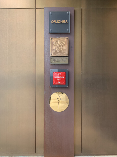 フィレンツェとシェナの中間位の古都コッレ・ディ・ヴァル・デルザの2つ星。早めに出たものの結果的にバス乗り間違えて、定刻15分遅れで到着。まだ1組しか着席していませんでしたが。ルレエシャトーになっている...