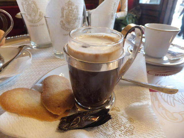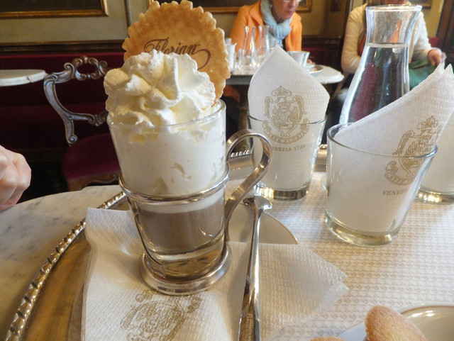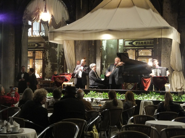 ベネチアで(世界で)最も有名な老舗カフェ「フローリアン」。ベネチアの顔「サンマルコ広場」にあります。普通2€で飲めるエスプレッソが6.5€もする店。だから地元民は行きません。物見遊山の旅行者ばかり。少し前はスッピンのレディ・ガガも滞在中毎日通っていたそうです。店の前では昼も夜もしばしば生演奏が行われます。演奏を聴きながら外のテーブルに着くか、煌びやかな店内で過ごすかは気分次第。いずれにしてもいつも旅行者でいっぱいです。