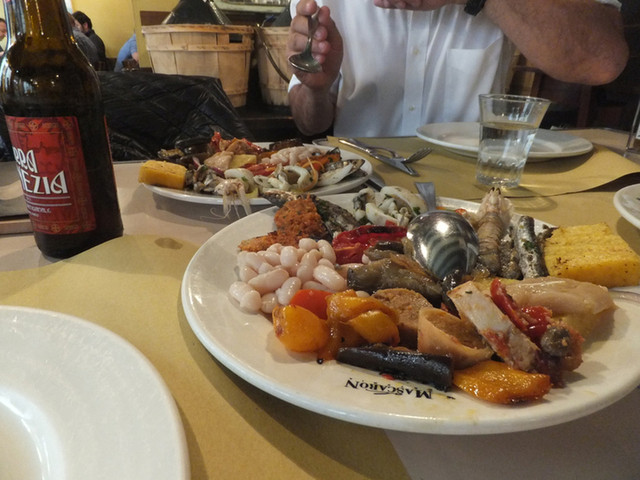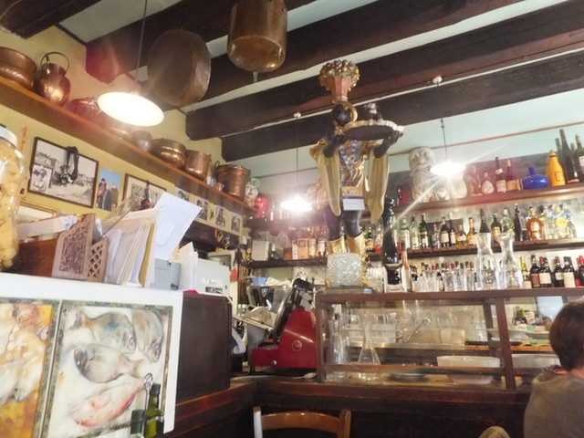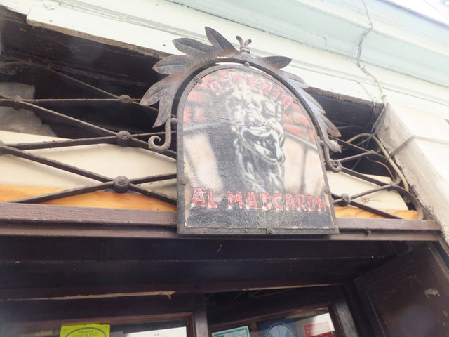 観光ガイドさん行きつけの店に連れて行ってもらいました。怖い仮面の看板が目印。近くの教会の壁にその本体がありました。鬼瓦みたいなものです。地元の人で賑わうカジュアルな店。この店でもオーナー家族が和気あい...