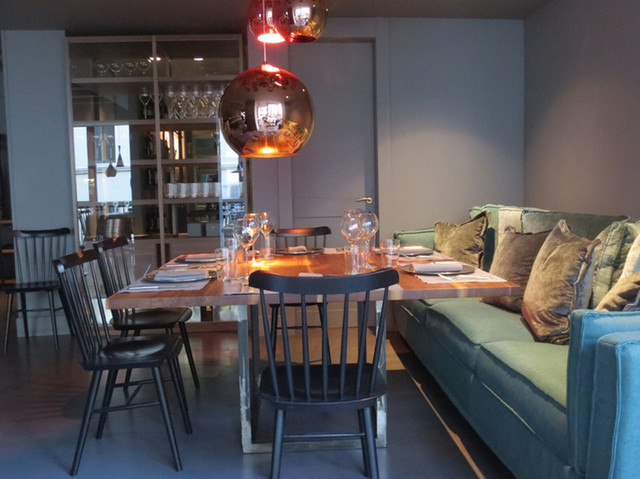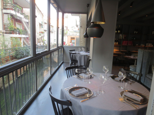 席は外と中のどちらが良いかと言われ、中が良いと伝えると、一番奥の川の見える席に通されました。ここはいわゆるモダン系ですが、本格派のモダン系です。私たちの川の見える席のほか、どこもこだわりを感じさせる席ばかりです。