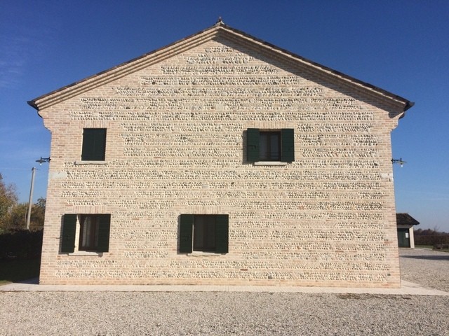 屋根瓦は古いものを流用し、外壁には古いレンガと礫が嵌め込まれている。