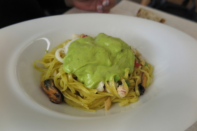 注文したのはカレーソースの揚げ物、蛸のバジルソース、黒トリフーソースのパスタ、バジルソースのパスタ