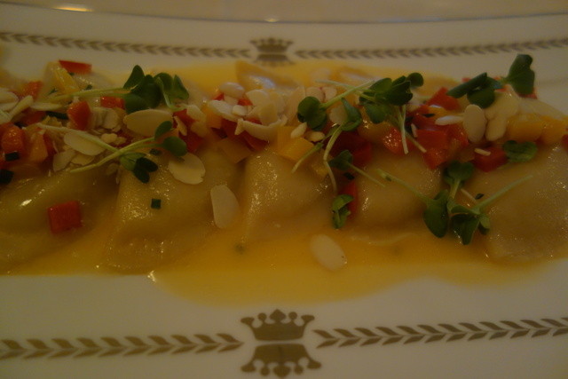 Homemade ravioli stuffed with monkfish and potatoes on a sweet pepper sauce 18€