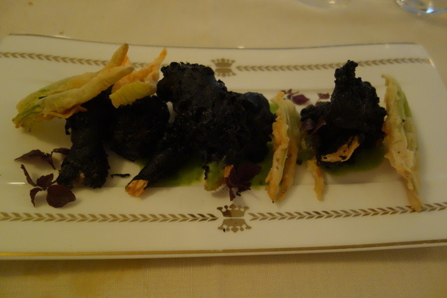 Tempura nera di capesante, scampi e gamberi con passatina di zucchini