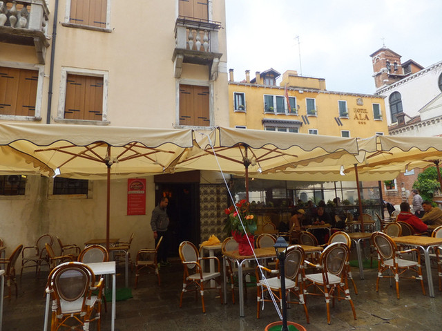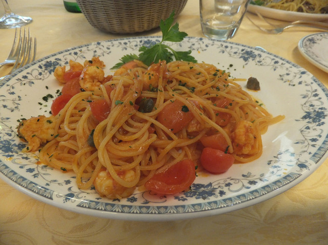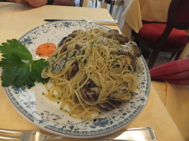 宿泊先のグリッティ・パレスから徒歩1分。地元のガイドさんお薦めの店。雨なので室内へ。この店はワインショップとしての歴史もあり豊富なワインが並んでいます。ヴェネチアのスパークリングワインいわゆる「プロセッコ」と、地ビール「Fabbrica di Pedavena」。ワイン代はサービスでビール代と合わせて6.5€。地元産、手長エビのスパゲッティ。美味いです。22€。ボンゴレスパゲッティ。地産地消で美味いです。20€。隣のテーブルではこの店のオーナー家族が和気あいあいと食事をしていました。注文を取りに来るおっちゃんが如何にもベテランの給仕長って風情で良い感じです。