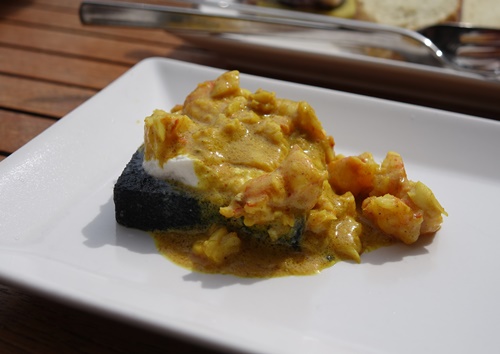 うっすらとカレーぽく味付けされた魚介たちが乗せられています