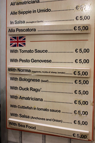メニューはパスタソースを9種類の中から選び、すべてが€5均一です。安いです。