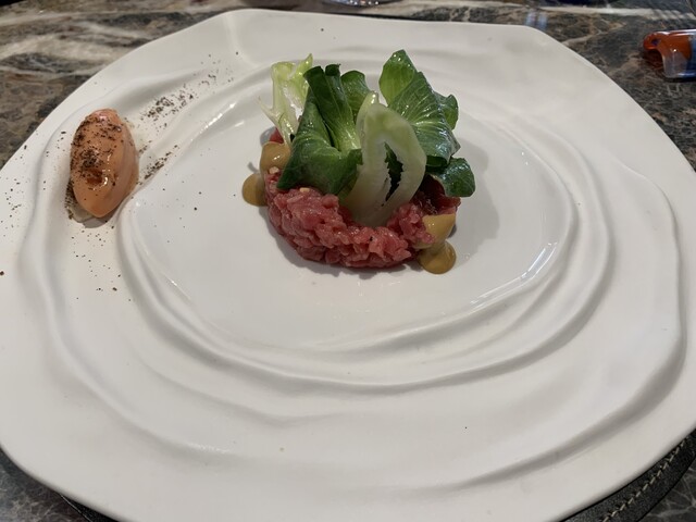 ねっとりとした柔らかな牛肉とフォアグラの濃厚な味わいが美味しい。少し酸味のあるソースと野菜でくどさが無くなる。
