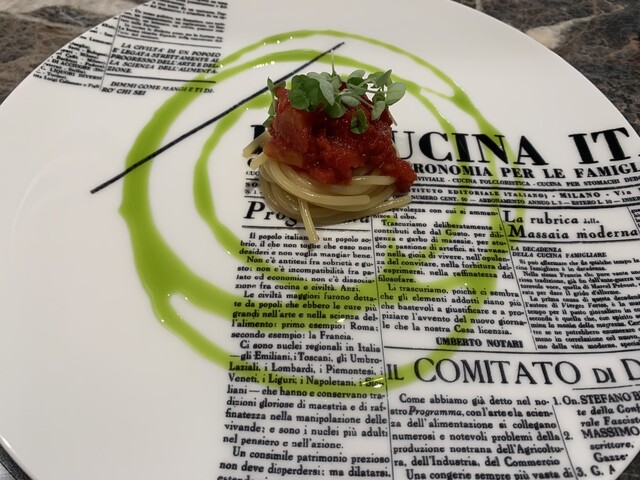 生、マリネ、ロースト、スパゲッティ仕立て、シュー生地に包んで。