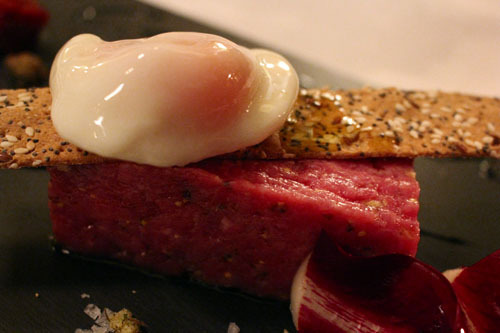 基本、シンプルな味付け(薄い)のタルタルで、 周りに華やかに散らした岩塩、胡椒、マスタードなど