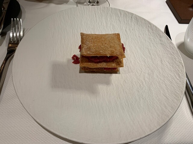 ミルフィーユ状にサクサクの生地と馬肉が交互になっている。