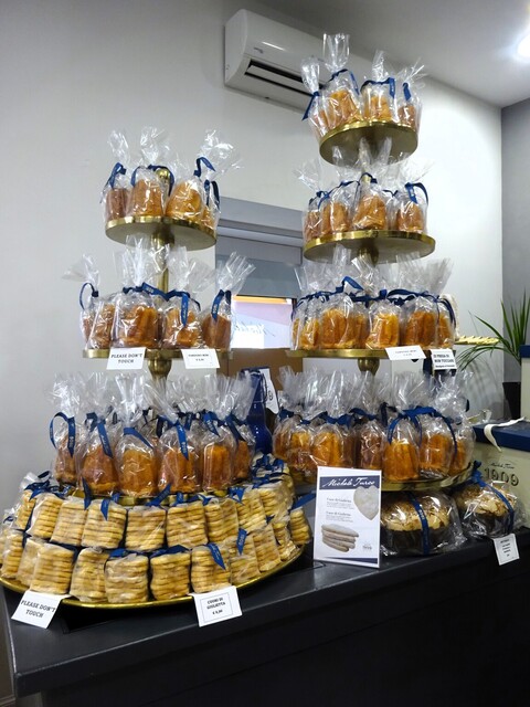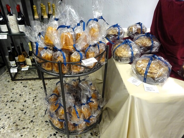 品揃えはタワーに積まれたPANDORO MINI(4.5€)、BUTTERFLY(オレンジの砂糖漬をトッピングした大サイズのお菓子(パネトーネに近い))(24€)、ハート型のクッキー。