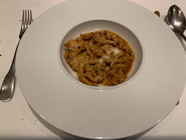 ジュリエット邸近くのビブグルマン、21時半予約。アラカルト組み合わせ3コース38€、ポーチドエッグ・ミックスパスタ・トリッパ。ポーチドエッグはクリスピーモノ多過ぎる印象ですが、お味3点抜群にいいです(๑˃̵ᴗ˂̵) 月曜晩は街中人少ないです。