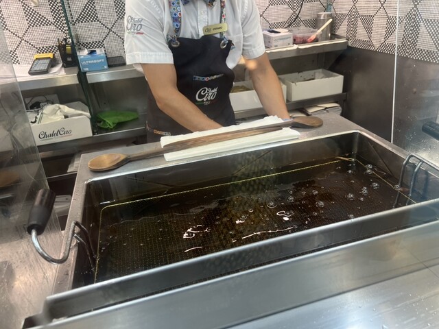 細長い棒の形状に伸ばしてからくるっと巻きつけ、揚げる。その後は木のヘラの様なものをドーナッツの真ん中の空洞部分に嵌め込み、一個ずつ丁寧にひっくり返して作って...