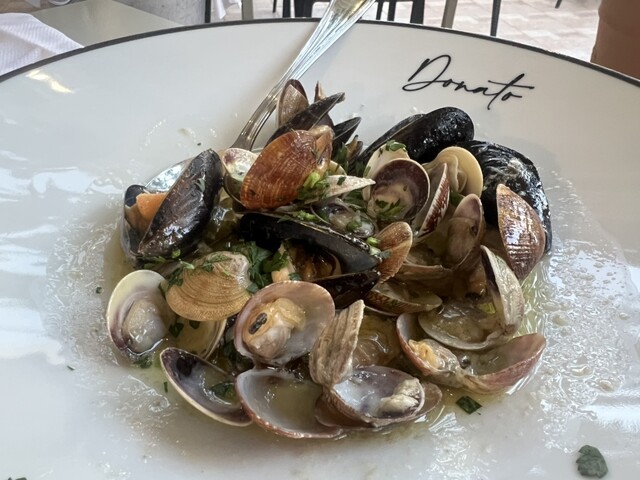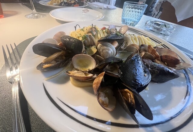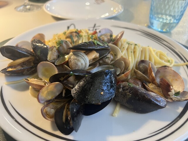 アンティパストミスト、前菜の貝のマリネ、ボンゴレビアンコ、名前は忘れてしまったがパイの塔みたいな美しいデザート。