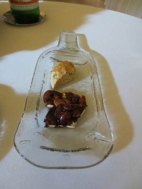 最後のデザートは、ミカンの皮をそのまま使ってアイスを包んだもの。周りにはホイップクリームとアーモンドソースがかかっていました。ミカンの皮は、冷凍状態でとても薄く、苦味もそれほどきつくなくて、創作料理ながら、さすが計算されたデザートを作り上げているなあと感じます。ただ、前のお肉で胃が苦しくなってきている中で、クリームにアイスはくどい気がしました。もっとあっさりさっぱりと締めたいところでした。