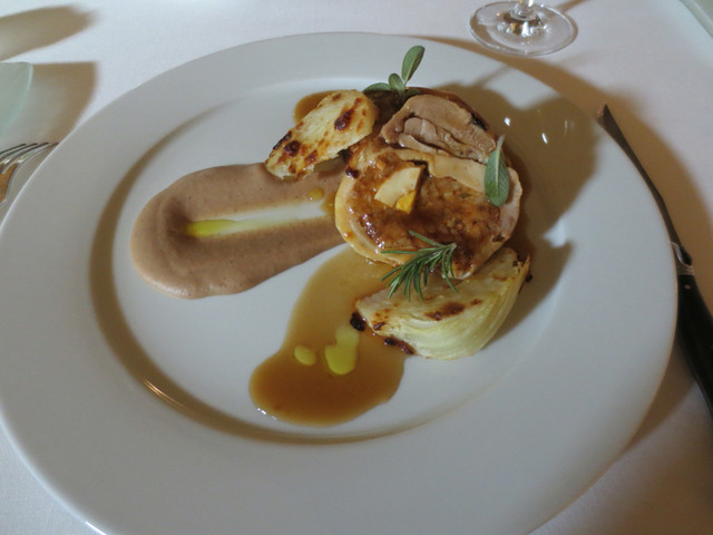 マグロのカルパッチョのシチリア産黒トリュフ添えは、黒いお皿に、かなりのボリュームで出されました。あっさりしたマグロは、マヨネーズ系ソースと絡めて食べても嫌味なく美味しく頂きました。トリュフは香りはそれほど強くないですが、スライスされたばかりの新鮮で贅沢な使い方がさすがミシュランと思わせます。ただ、マグロとの相性は微妙な気もしました。