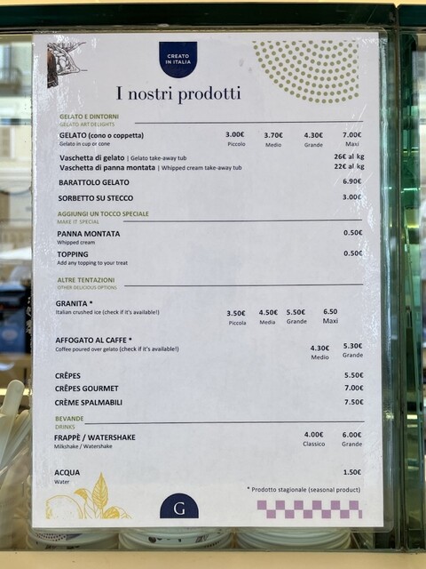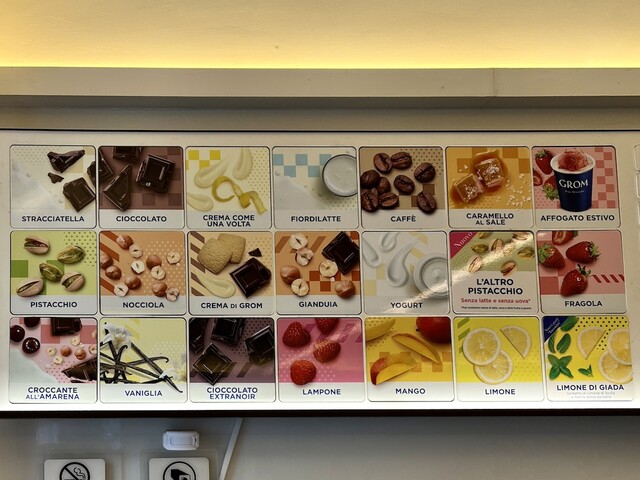 行列が店の外まで続いている光景を目にして「何だろう?」と覗いてみたのがきっかけですが、自分の番が来て「マダガスカル産バニラ ジェラートとシラクーサ産レモン ソルベをメディオのコーノで下さい。」と頼んだら目のクリッとした可愛い店員が、「あなた、日本人ですか? GROMは原宿にもありますよ。」とイタリア語で笑顔とともに話しかけてくれ、一度でGROMのファンになってしまいました。