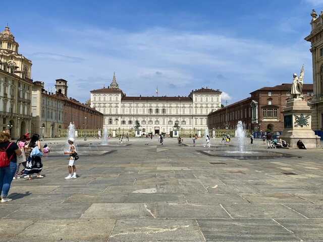 Palazzo Reale D'ITALIA 前の広場で水遊びする市民
