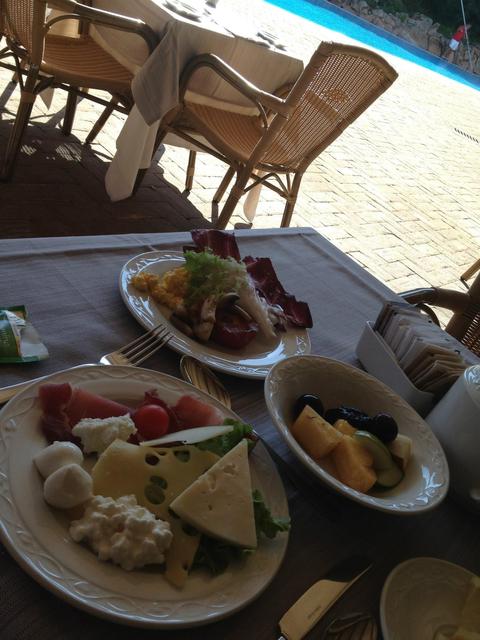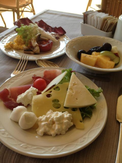チーズ、ハム種類豊富で、プールの向こうの山と可愛いインテリアに囲まれてゆっくり楽しめます。