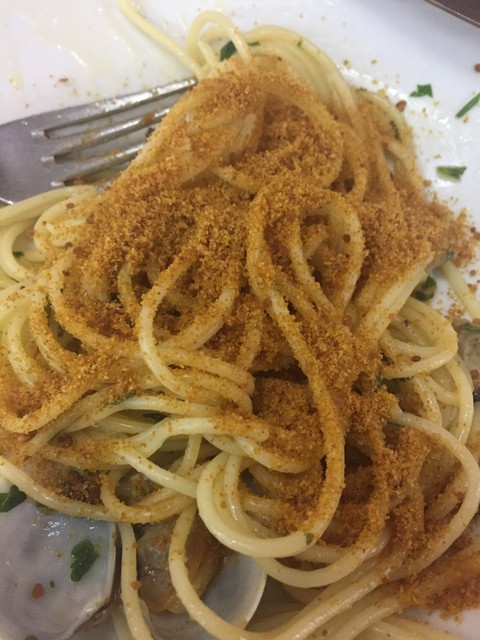 「Trattoria Lillicu」ではspaghetti alle arselle e bottargaを注文するとspaghetti alle arselleが出てきて、ボッタルガパウダーはガラスの器にたっぷりと出てくるので、ちょいちょいかけ足しながら食べ進めるのが美味しい食べ方です。