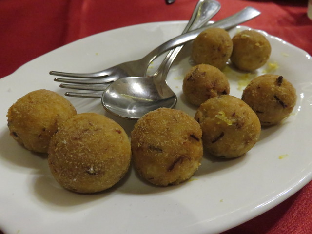 前菜は、白身魚の揚げ団子。レモン風味で、塩味は控えめで美味しいです。魚肉はかなり細かくほぐしてありました。