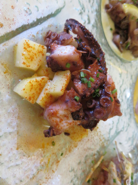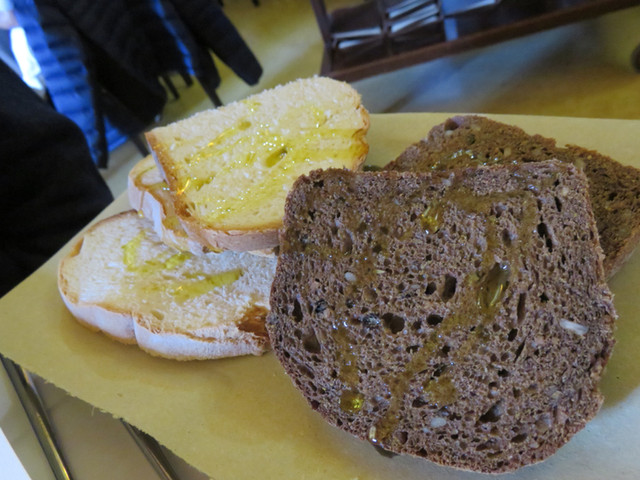 最初にパンが出てきて、すぐにたっぷりのオリーブオイルをパンの上にかけてくれました。オリーブオイルは、ピリッとした辛味のある新鮮なもので、強さはミディアムくらいです。パンの旨味もかなり楽しめるものなので、オリーブオイルは自分のペースで付けながら食べたかったなと思いました。