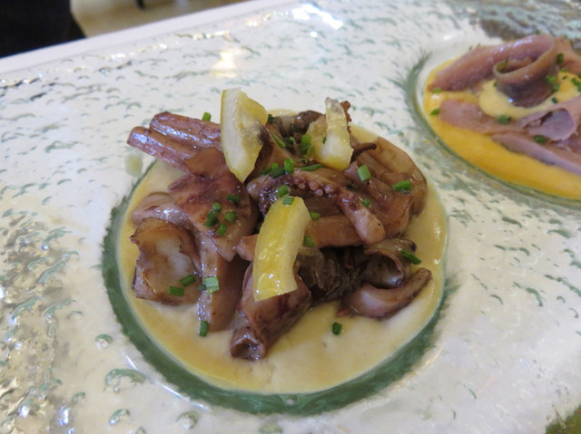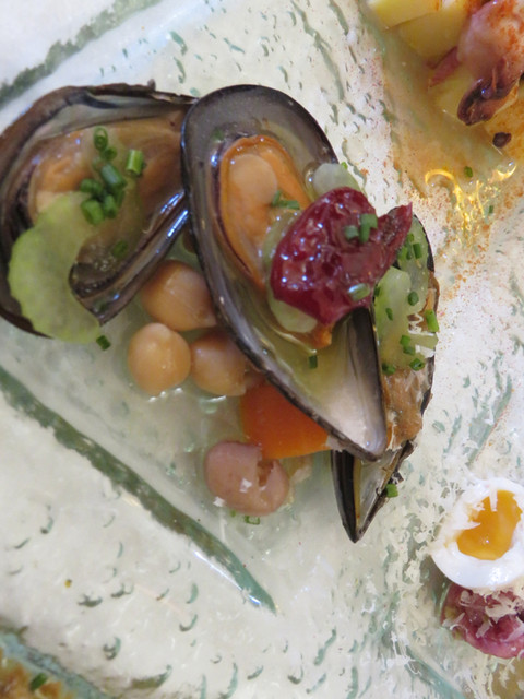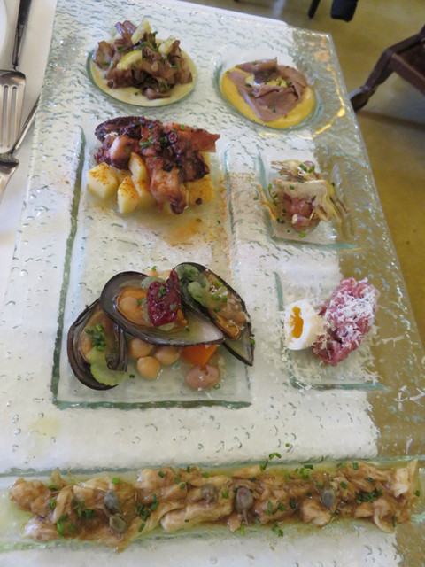 前菜は、海鮮6種の盛合せ18ユーロ。プロモーションとのことで、さらに1品サービスで付いてきました。これがどれもすごい!食材の味がどれも美味しく、それを最大限に生かしているのがよく分かります。
