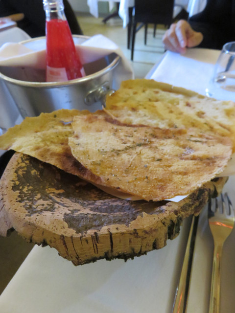 パーネ・カラサウは、かなり塩味とオイルが強く、オレガノ?がかかっていました。熱々で、サルデーニャ特産のコルクの木にのってきます。とても美味しく、私たちも、周囲のみんなも、何回もお代わりをしてました。