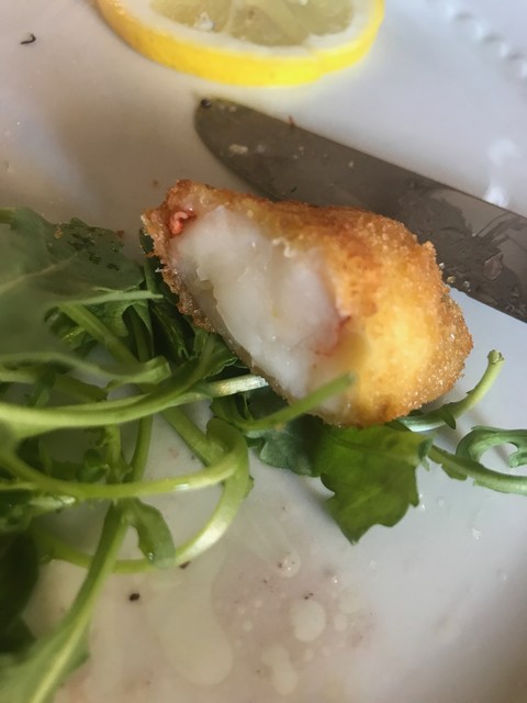 カニにチーズを巻いて揚げたもの、レモンの味がきいた前菜のマリネも満足です。