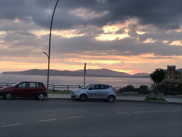 この日、2週間前までペーパードライバーだった私が、日本でのドライビング講習を経て、イタリア出発日に初めて一人で公道で運転したばかりという状態でイタリアに渡り、この日、大きな挑戦をしていました。南東の待Cala Canterinaの街から、北西のアルゲーロまで、くねくねの険しい山道を中心に、385キロ、8時間45分の運転をし、何とか日が沈む前にアルゲーロにたどり着きました。