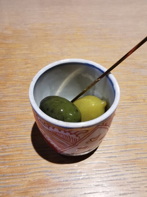 緑色の小さ目なのが小豆島オリーブでシャキシャキとした食感と