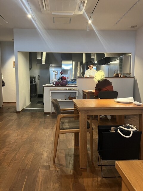 広々としたテーブル席は2卓。ご夫婦が奏でる極上のランチコース。柔らかな木の質感のテーブルはイタリア製。
