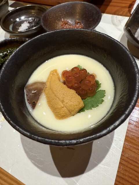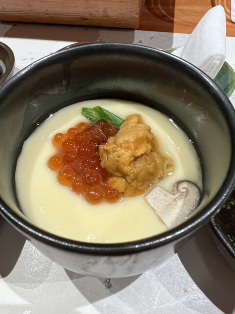 雲丹とサツマイモの茶碗蒸し イカとメイチダイも入っており、宝石箱状態。