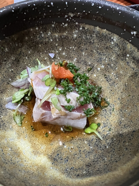 天然カンパチ(ショッコ)こちらも神経生締めで透き通るくらいで血や臭みとは無縁。野村ポン酢と最強コラボ
