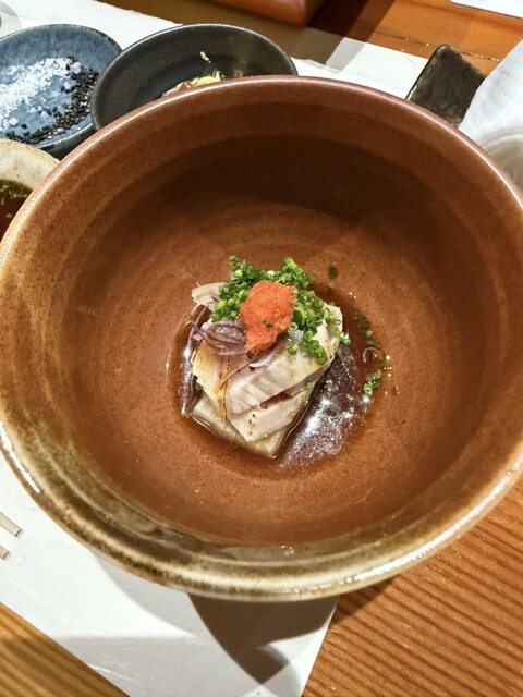 夏はやはり鹿児島は大根でしょう!とのことで、贅沢にもメイチダイの身をほぐして大根のお椀に!ほんのり辛味が心地よい。