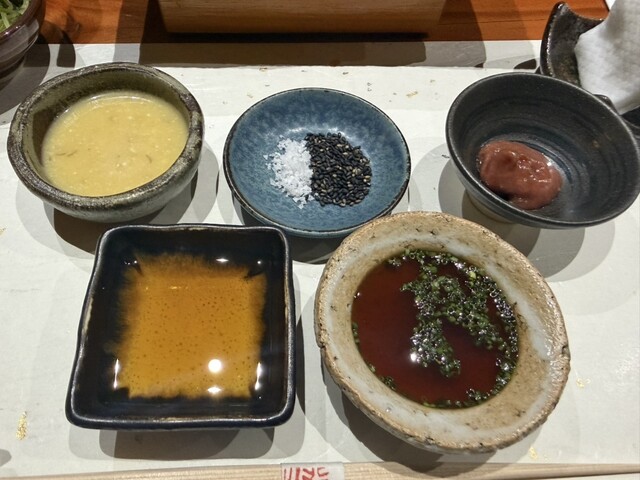 予約していたカウンターに美しく並べられた薬味を見て、早くも食欲があふれだします。