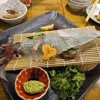 ...お酒は、早々に黒霧島のボトルを入れて、お湯割りでいただきました。 注目の自慢の刺身の盛合せは、九州らしい、太刀魚、クエ、ボラといった変わ...