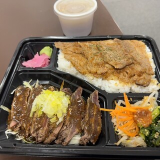 ...ひろみ〜♪ 初めてだったのでおすすめの2種盛り牛肉弁当をテイクアウトしました。 2種盛りはカルビとサガリのステーキでお肉の量でラージも選べました。 カルビもサガリも柔らかくて美味しかったです...