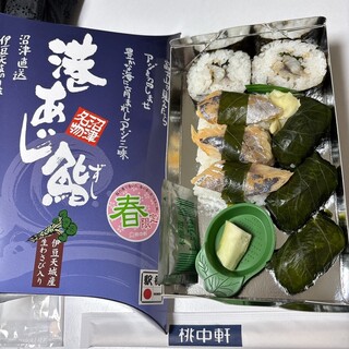 ...■こばやし極撰炭火焼き牛たん弁当 ■港あじ鮨弁当、1,180円 ■結構ボリュームあり ■右半分アップ...●その101 沼津駅 桃中軒 港あじ鮨弁当 1180円 伊豆半島周辺の名産を詰め込んだ酢めし弁当。...創業明治24年、株式会社桃中軒の港あじ鮨弁当...