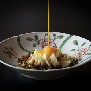 ...赤い千切りは、金時人参? 私、紅ショウガの千切りかと思って食べていました。 さすが京都の懐石は、ショウガもこんなに繊細に切るのね。 そして、ちょっとショウガをからめると...