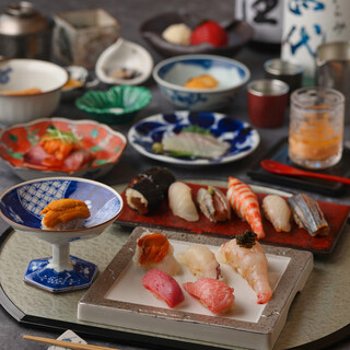 ...ポン酢ジュレ メイチダイ 骨醤油 ボタン海老と紫雲丹 松茸のお碗 げそ炙り イワシのオイルサーディン 蒸し鮑とシャリゾット 赤雲丹の小丼 握り 剣先イカ 甘鯛 宮城のマグロ 炙り鰹 鯵 中トロ 大トロ 赤甘鯛の焼き物 毛蟹の卵あんかけ 穴子の小丼 たまご...